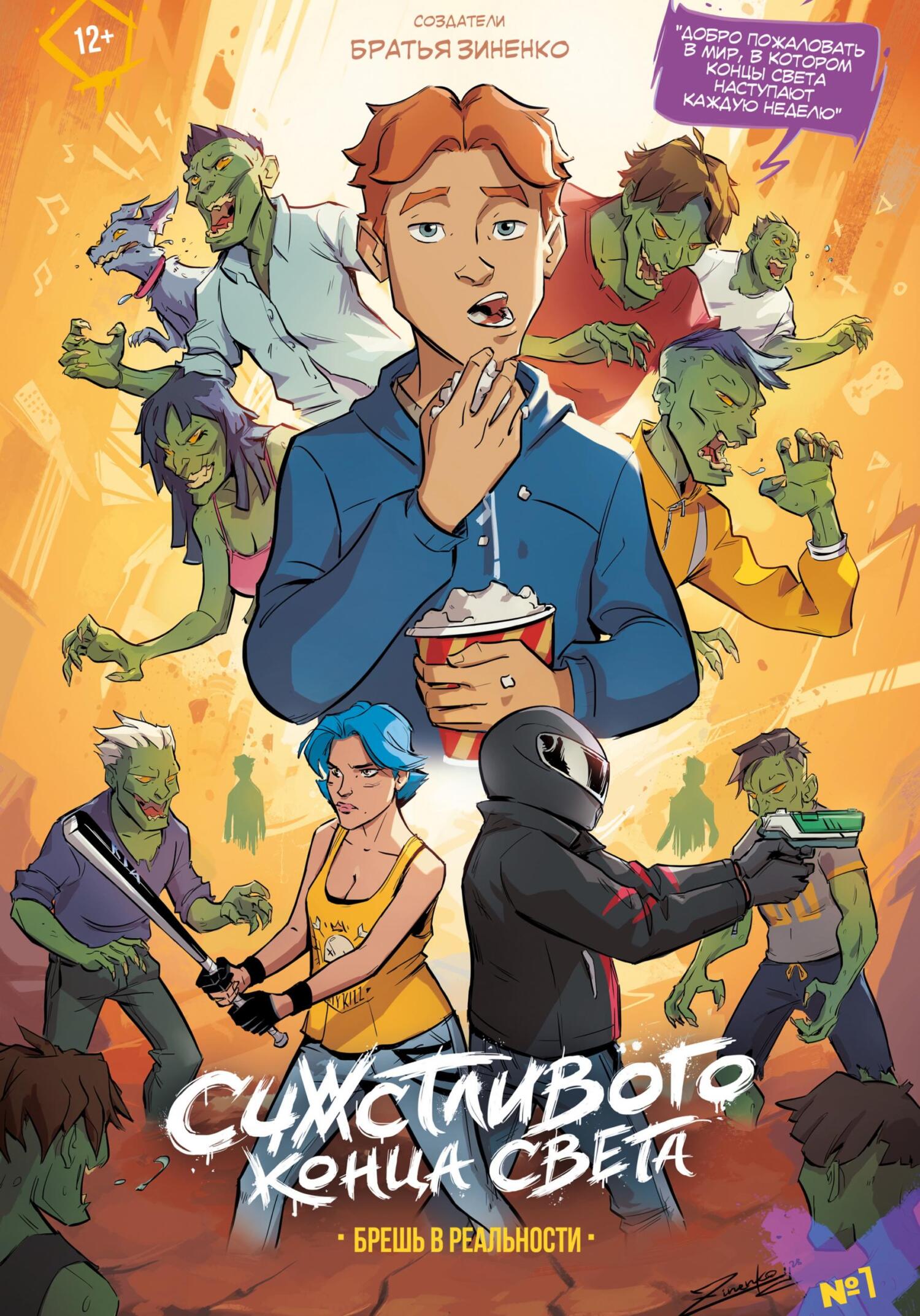 "Добро пожаловать в мир, в котором концы света наступают каждую неделю. На Землю то и дело обрушиваются свирепые монстры и необъяснимые катаклизмы. Жизнь с каждым днём становится до смешного безумной. Остаётся только сидеть дома и наслаждаться остатками спокойной жизни в компании телевизора. Но как быть, если твоей спокойной жизни наконец наступит конец?" Преимущества: Невероятно красочное комедийное приключение от братьев Зиненко близкое к манере французского комикса, где на каждой странице больше кадров, чем мы привыкли видеть. Точно такой же красочный рисунок на каждой странице, а не только на обложке, как бывает с другими комиксами.