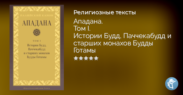 «Ападана» – одна из книг Кхуддака-никаи, входящей в Палийский канон. Это канонический сборник автобиографических стихотворений тхер (старших монахов) и тхери (старших монахинь), достигших освобождения во времена Будды Готамы. В этих историях старшие члены Сангхи Будды Готамы от первого лица рассказывают о своих встречах с многочисленными буддами прошлого, говорят о благих и неблагих поступках, которые направляли их к освобождению или препятствовали ему. Три истории рассказаны самим Буддой Готамой, это: «Буддхападана» (История Будд), «Паччекабуддхападана» (История самостоятельных Будд), а также «Пуббакаммапилотикабуддхаападана» (Истории Будды, обрывки прошлой каммы). В данном издании Ападана разделена на два тома. В первый том вошли истории, рассказанные самим Буддой Готамой, и первая часть историй старших монахов.