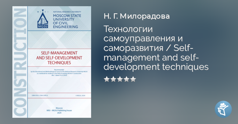 The materials of the textbook for the course «Technologies of self-government and self development» are aimed at mastering psychological and sociological tools for acquiring socio psychological competence as the basis of competence. For students in the field of training 08.04.01 Construction.