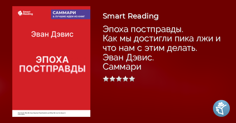 Это саммари – сокращенная версия книги «Эпоха постправды. Как мы достигли пика лжи и что нам с этим делать» Эвана Дэвиса. Только самые ценные мысли, идеи, кейсы, примеры.