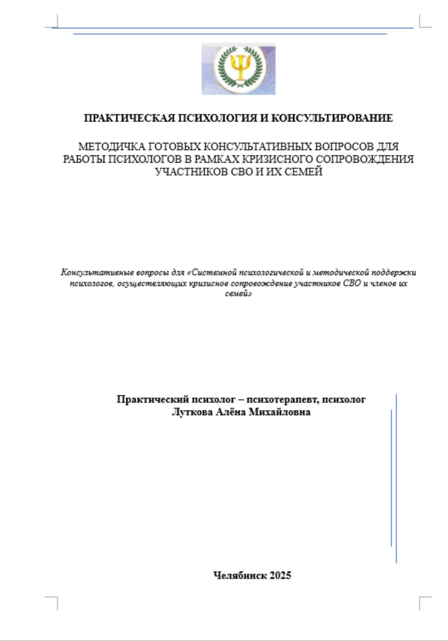 Данная методичка предназначена для специалистов, работающих в сфере психологической поддержки участников СВО (Специальной военной операции) и их семей. Документ разработан с целью систематизации ключевых этапов предоставления кризисного сопровождения и включает подробную структуру консультативного процесса, направленного на диагностику, поддержку и восстановление психологического состояния клиентов. Методичка предлагает набор эффективных вопросов, ориентированных на установление контакта, анализ текущей ситуации, оценку эмоционального состояния, преодоление кризисных состояний, а также развитие ресурсного потенциала. Особое внимание уделено практическим аспектам психологической помощи военнослужащим в условиях посттравматического стресса и их близким, оказавшимся в затруднительном жизненном положении. Методичка станет полезным инструментом для начинающих и опытных психологов, обеспечивая устойчивую систему работы в условиях повышенного стресса и социальной напряженности.