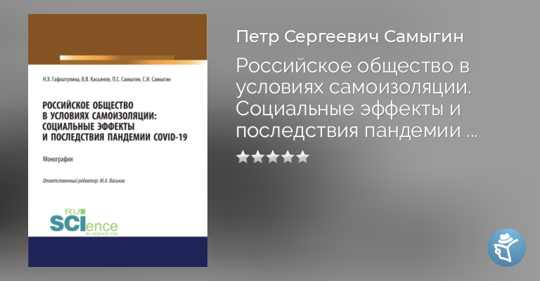 В монографии рассматривается одна из актуальнейших проблем современной действительности – проводится серьезный социологический анализ российского общества в условиях самоизоляции, рассматриваются социальные эффекты и последствия пандемии COVID-19. В науке в таком ракурсе еще не было проведено такого рода исследований. В коллективной монографии представлено авторское осмысление проблем функционирования и развития общества, вынужденного находиться на самоизоляции в период пандемии COVID-19. Значимое место уделено проблеме рискогенного влияния на социальное здоровье и социальный иммунитет общества, а также проблемам образовательного пространства в условиях самоизоляции. Структура монографии состоит из четырех глав по три параграфа в каждой главе. Авторы первой главы: Самыгин П.С., Гафиатулина Н.Х., Самыгин С.И., авторы второй главы: Гафиатулина Н.Х., Самыгин П.С., Касьянов В.В., авторы третьей главы: Гафиатулина Н.Х., Касьянов В.В., Самыгин С.И., Васьков М.А., авторы четвертой главы: Касьянов В.В., Гафиатулина Н.Х., Самыгин С.И. Монография адресована широкому кругу читателей: научным работникам, преподавателям гуманитарного цикла, докторантам, аспирантам, магистрантам, а также всем, интересующихся проблемами российского общества в условиях самоизоляции в период пандемии коронавируса.
