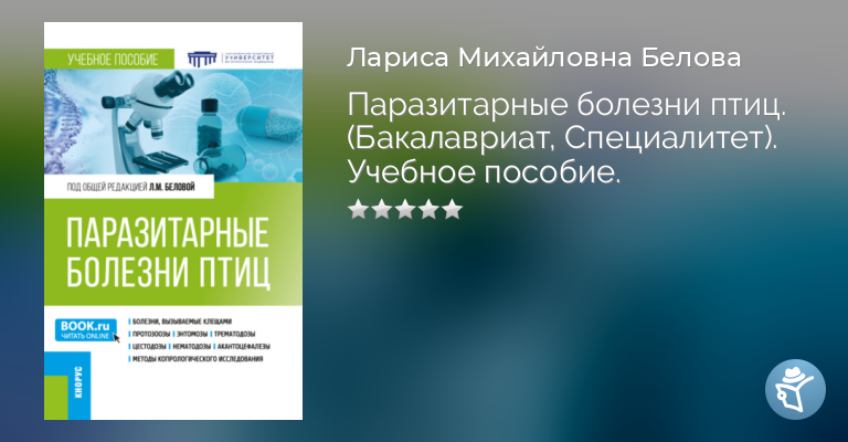 Изложены сведения о наиболее распространенных в России и в зарубежных странах паразитарных болезнях птиц. Рассмотрены вопросы современных методов диагностики и организации лечебно-профилактических мероприятий при инвазиях птиц. Пособие иллюстрировано рисунками, схемами цикла развития паразитов, позволяющими учитывать данные при диагностике болезней. Дает возможность получить знания по морфологии паразитов, их циклам развития, изучить пути выделения из организма, методы их обнаружения. Соответствует ФГОС ВО последнего поколения. Для студентов бакалавриата, обучающихся по направлениям «Биология», «Ветеринарно-санитарная экспертиза», и студентов специалитета, обучающихся по специальности «Ветеринария».
