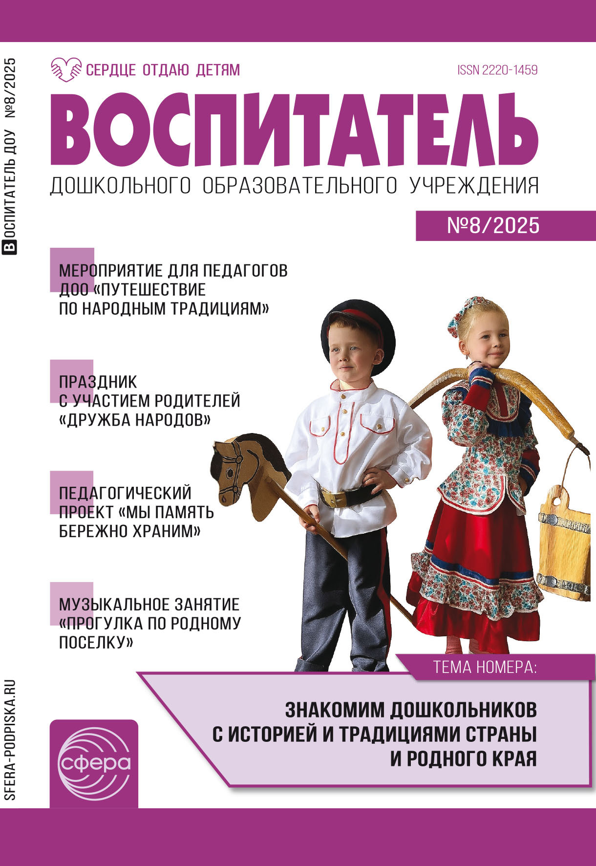 Журнал для воспитателей ДОО, логопедов, музыкальных работников, методистов и специалистов сферы дошкольного образования. Особенность проекта – регулярные региональные номера, отражающие национальную специфику представленных областей и краев страны, которые не только интересны, но и полезны для обогащения копилки профессиональных знаний и умений. Журнал-помощник, журнал-собеседник, журнал-учитель и друг для всех, кто трудится на благо детей, ежедневно решая непростые задачи дошкольного образования. Практико-ориентированные, самобытные материалы со всех уголков страны, ближнего и дальнего зарубежья. Прекрасная возможность регулярно получать информацию о происходящих событиях, обмениваться опытом, инициировать и вести дискуссии по наиболее острым и волнующим вопросам воспитания дошкольников. «Воспитатель ДОУ» – это: – четкая структура каждого номера, построенная в логике режима дня ребенка и воспитателя (разделы Утро, День, Вечер, Ночь); – методологическое, теоретико-методическое и социокультурное сопровождение процесса воспитания и развития дошкольников с учетом рекомендаций и требований ФГОС ДО и ФОП ДО; – инновационные практики, конспекты занятий образовательного, воспитательного и развивающего характера, проектная деятельность, планы непосредственной образовательной деятельности (НОД) и организованной образовательной деятельности (ООД), оригинальные авторские сценарии мероприятий (театральных постановок, праздников, досугов, совместных со взрослыми и пр.); – авторские, апробированные практикой и новые методические разработки по организации педагогического процесса в ДОО России и зарубежных стран; – технологии и опыт взаимодействия специалистов ДОО с семьями воспитанников.