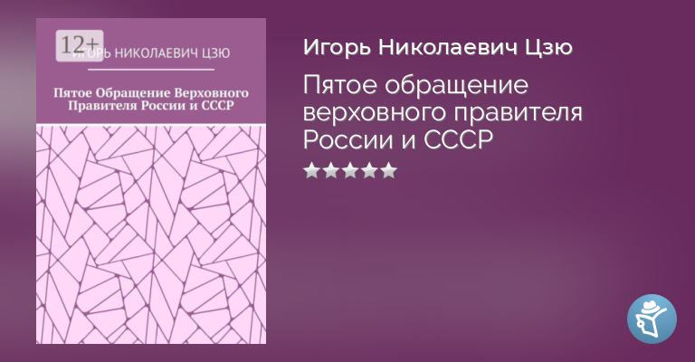 «Пятое обращение верховного правителя России и СССР» – заключительная книга, как писателя, Игоря Николаевича Цзю. Надеюсь, что мои книги помогли читателям в духовных поисках Истины и поисках достижения высоко духовного, нравственного и материального благополучия современного общества.